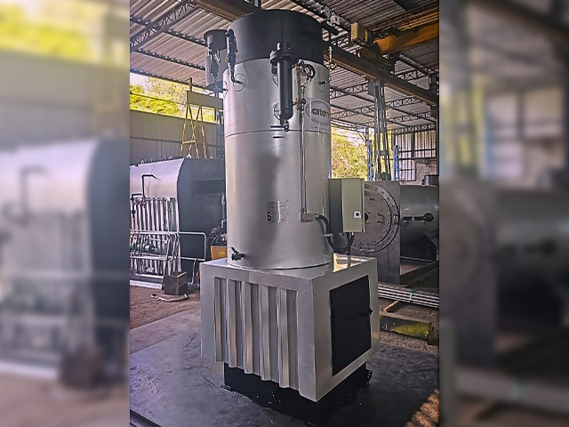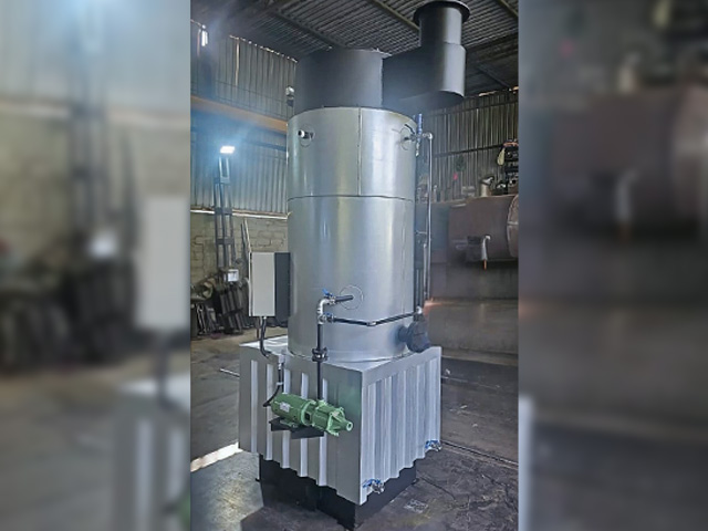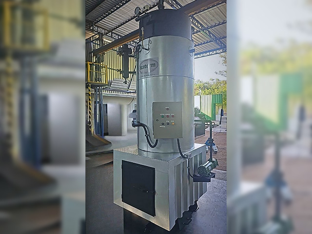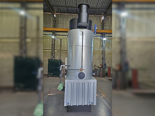 Caldeira Geradora de Vapor Vertical Flamotubular, com fornalha integrada para queima de lenha, projetada para operação com elevado rendimento térmico!